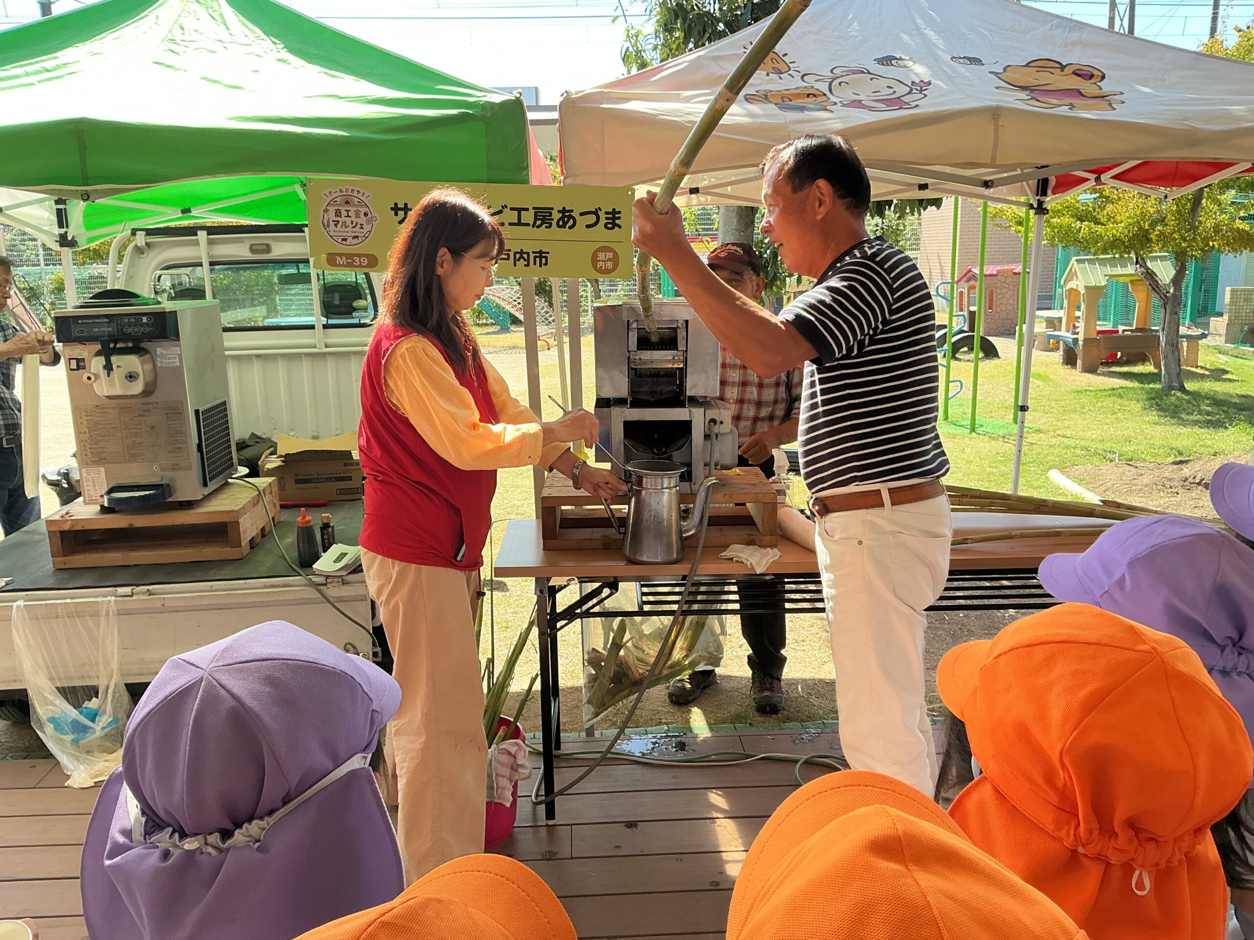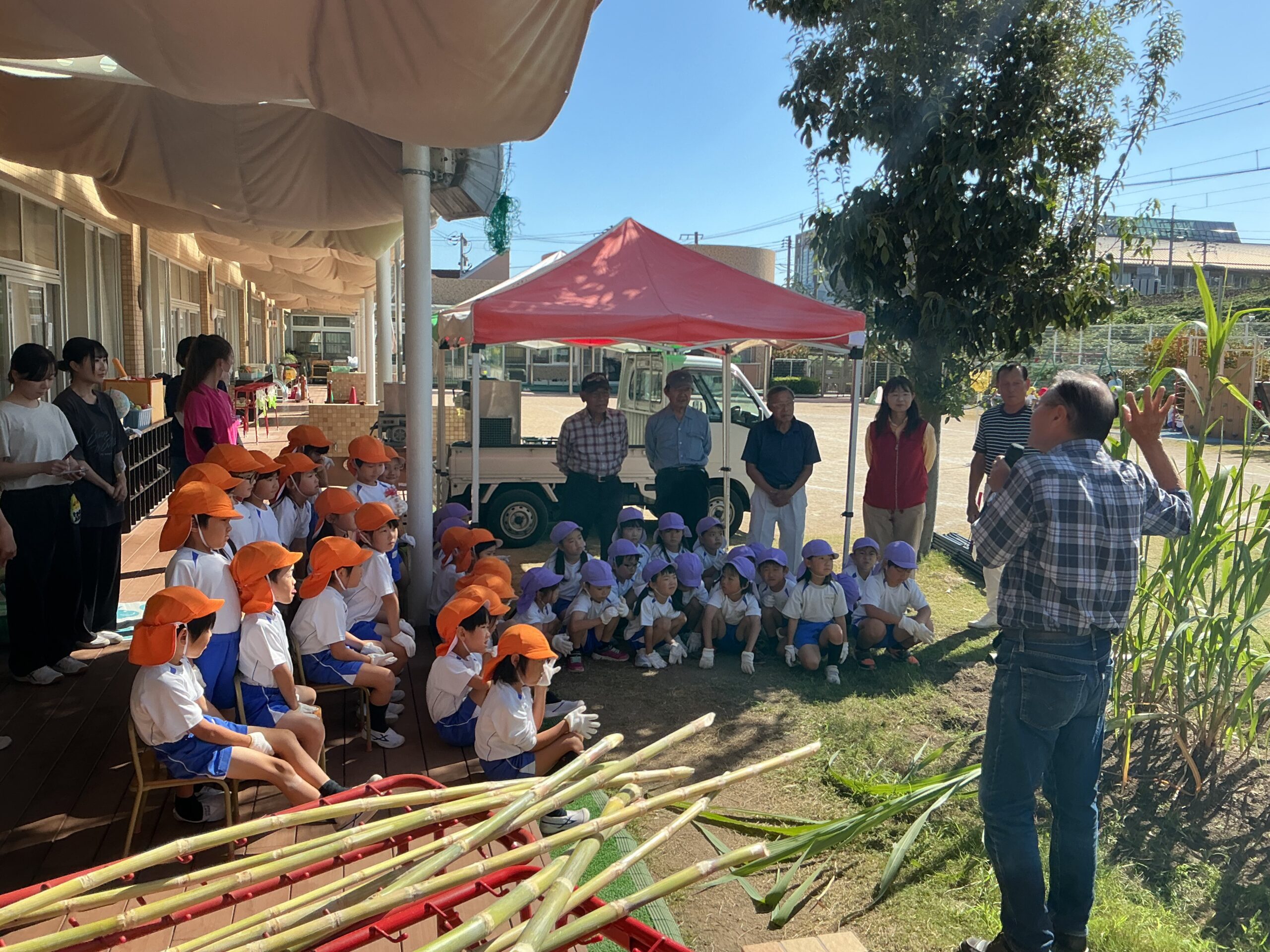 10月17日(金)楽しみにしていたサトウキビの食育活動でした!就実の森でいつもお世話になっている森の先生たちや瀬戸内市でサトウキビを栽培して販売もされているあづまさんが来て子ども達に話をしてくれました。「サトウキビから、砂糖ができる」ということが子ども達にとって不思議だったようで、興味津々で話を聞いていました♬ 「サトウキビは寒いところではできない」「たくさん煮詰めたら砂糖になる」などいろいろなことを教えてもらいました。実際に目の前でサトウキビを絞ってジュースを試飲したり、サトウキビを使ってソフトクリームを作ってもらって食べました!「いつものソフトクリームと違う!」「甘くておいしい!」と大満足でした! 「砂糖になるまでに時間がかかって大変」 「収穫して、絞って、たくさん煮るのが大変」 「普通の白い砂糖よりおいしい!」 などたくさん子ども達は学んだようです!