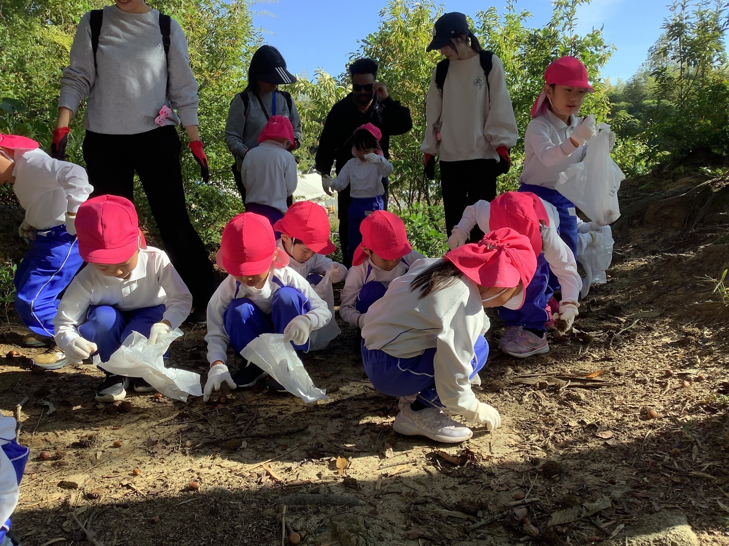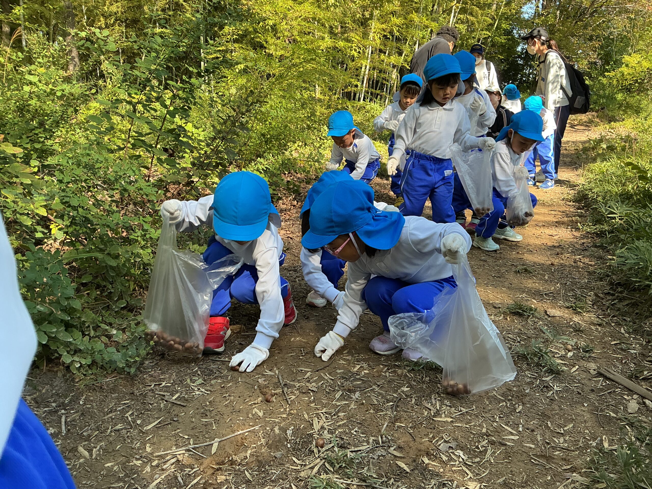 気持ちの良い秋晴れの下、就実の森に散策に行きました。気合十分で森の中に入るとたくさんのドングリが落ちており、「ふとっちょドングリ見つけたよ」「赤ちゃんドングリあった!」「帽子かぶったドングリもあるよ」と発見したものを友達と共有しながら夢中になって拾う姿が見られました。他にも森の中には古墳やイノシシのお風呂などがあり、話を聞いて興味をもっていました。
