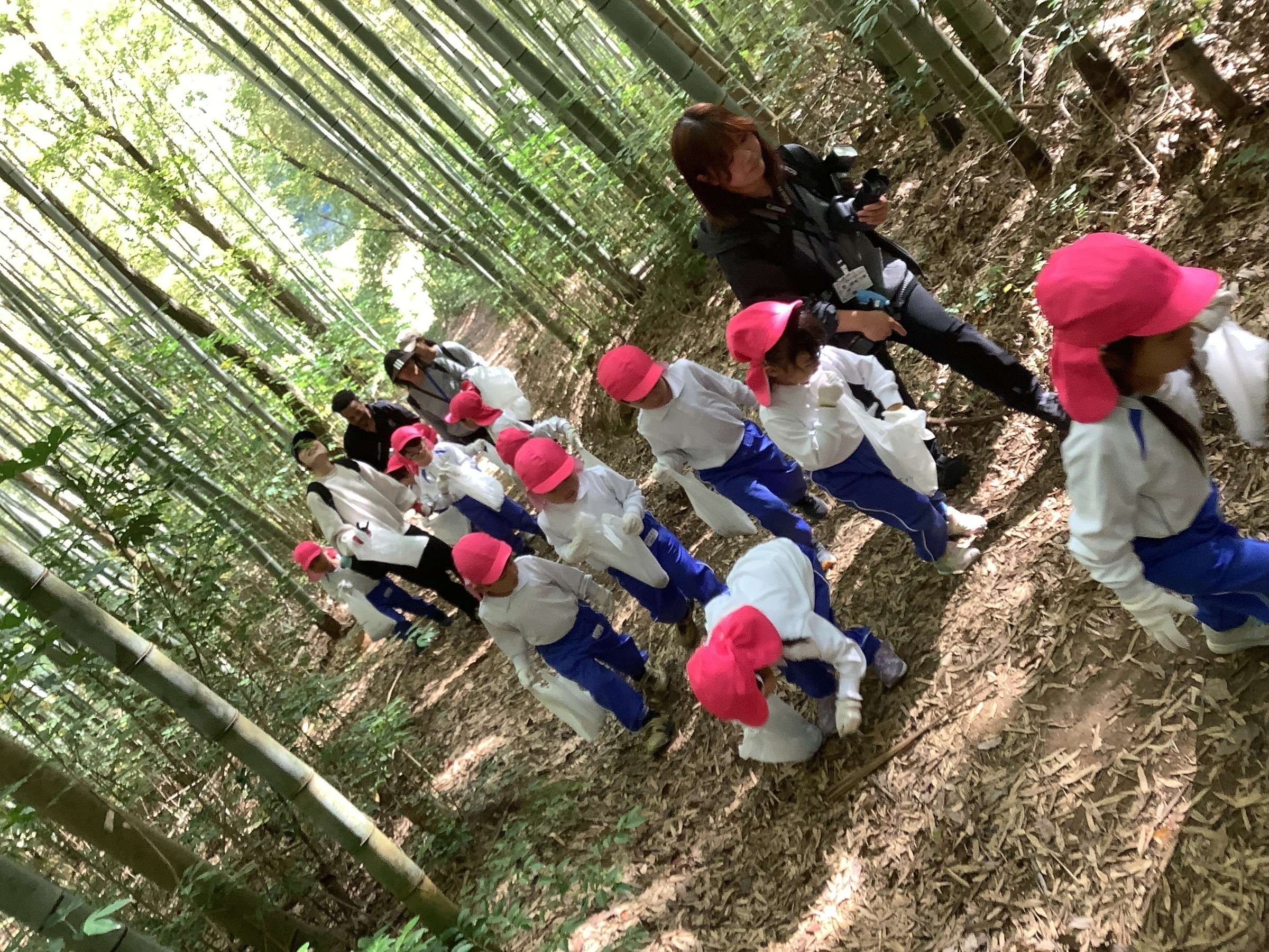 気持ちの良い秋晴れの下、就実の森に散策に行きました。気合十分で森の中に入るとたくさんのドングリが落ちており、「ふとっちょドングリ見つけたよ」「赤ちゃんドングリあった!」「帽子かぶったドングリもあるよ」と発見したものを友達と共有しながら夢中になって拾う姿が見られました。他にも森の中には古墳やイノシシのお風呂などがあり、話を聞いて興味をもっていました。