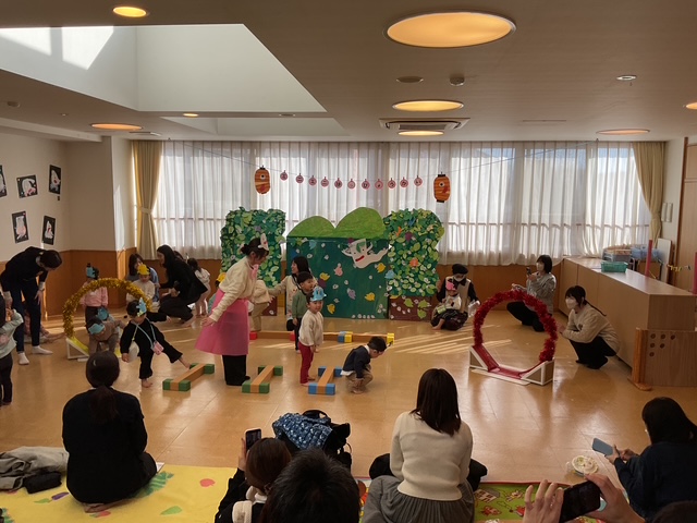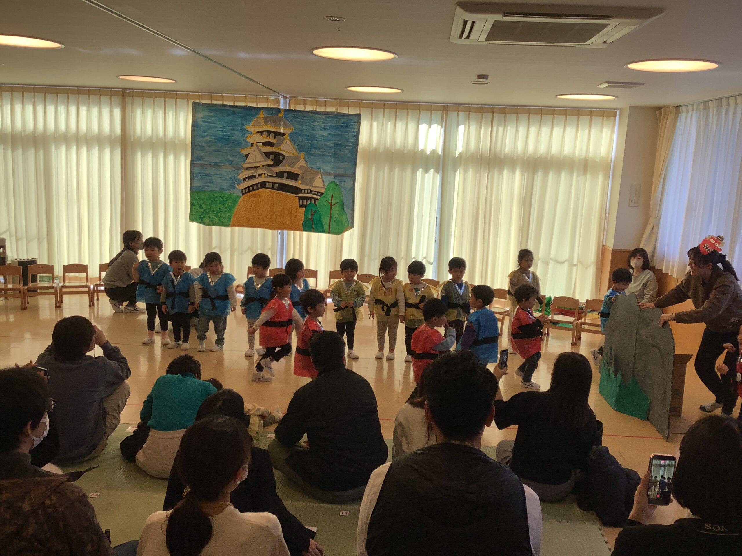 大勢のお家の方の前で少し緊張した表情でしたが、始まる前にお家の方に手を振ると安心したようで笑顔になっていました。鈴を使った楽器遊び『ゆきだるまのチャチャチャ』では、リズムに合わせて鈴を鳴らしたり、歌『ゆきのこぼうず』では手遊びも交えて楽しく歌ったりする姿が見られました。劇遊び『じゃじゃじゃのにんじゃ』では、恥ずかしくなる様子もありましたが、自分の名前を言ったり、忍者になりきっていろいろな忍術を披露したりしました。忍者になりきって表現する姿がとても可愛かったです!最後はみんなで『へんしん!にんじゃじゃん』の体操でパワーアップし、岡山城を守っていくことを誓ったこあら組忍者でした!
